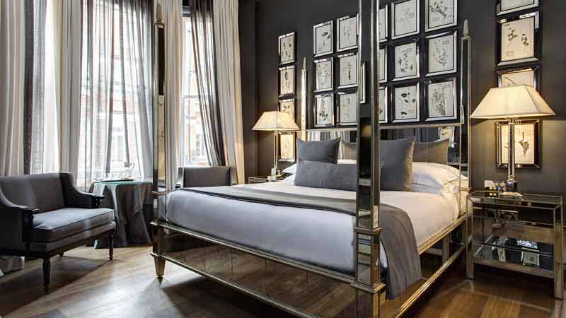 A l’hôtel The Franklin, il n’y a pas de comptoir ou de lobby. Ici, rien n’est formel à contrario d’autres hôtels que l’on peut trouver à Londres. Au Franklin, les hôtes sont accueillis par un accompagnateur et sont invités à s’installer confortablement dans l’un des nombreux fauteuils moelleux pour un café ou une tasse de thé en attendant le check-in. Le temps de s’imprégner de cet esprit chic mais moderne à souhait. Le gris et blanc dominent au Franklin, selon le souhait d’Anouska Hempel (à l’origine du Blake à Amsterdam et de l’hôtel Baccarat à Rabat). Cette demeure exquise donne l’impression d’un retour dans les années 20 et 30, tout en gardant un pied dans le présent. Miroirs abondants, rideaux en velours et soie, sol en marbre de Carrare, l’inspiration Art Déco est de mise, le tout sans oublier les touches de références anglaises, comme le papier peint romantique ou encore le mobilier Louis XV.