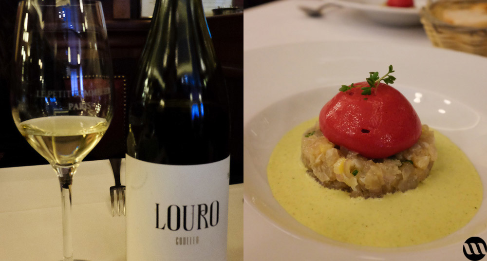 Car là où le Petit Sommelier sort son épingle du jeu, c’est dans le choix des vins. Plus de 700 références, dont 25 vins différents servis au verre. La plupart provient de nos belles régions françaises, mais Pierre a également tenu à inclure des vins de caractère, étrangers, que l’on ne peut retrouver facilement en France. C’est le cas du Louro, qui nous a été servi en premier, un vin blanc espagnol avec des notes de pommes granny ; fruité sans être trop sucré. Parfait pour accompagner notre première entrée : un tartare de dorade au citron confit, lait de concombre et émulsion de betterave. Que dire si ce n’est que c’est frais, croquant et doux en bouche. La petite touche de curry et le citron confit associés au tartare de dorade apportent une touche légère au plat. Parfait pour un début de repas.