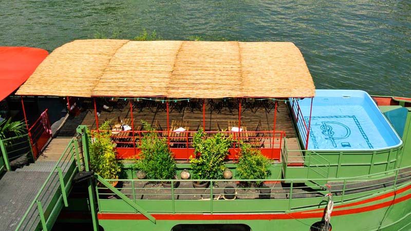 Parmi les péniches à Paris, la piscine du Playtime pourrait presque passer inaperçue. Installée face à la Cité de la Mode et du Design, elle offre un cadre sympathique et une vue idyllique. Sa piscine vaste, juste comme il faut, est idéale pour y piquer une tête ou tremper ses pieds, un verre à la main. A noter qu’il faut consommer pour pouvoir accéder à la piscine du Playtime. Sur le pont, la terrasse verdoyante dispose de gros fauteuils pour se prélasser, et le restaurant joliment décoré dans des tons clairs et lumineux, peut accueillir environ 60 couverts.