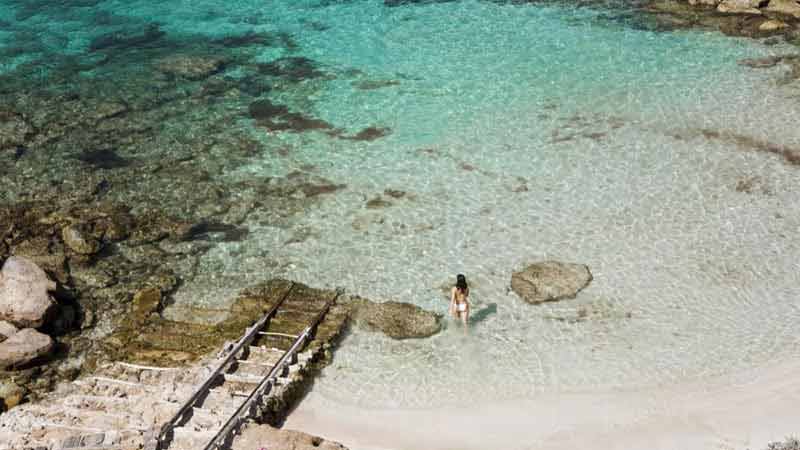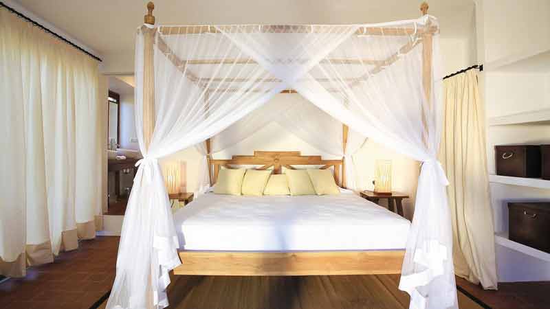 L’hôtel chic et rustique prend l’aspect d’une grande maison de famille comportant huit chambres. Idéal donc pour partager des moments avec d’autres voyageurs ou alors passer des vacances entre amis. A l’extérieur, chaises longues et lits à baldaquin trônent sur des rochers et surplombent la mer azur. Juste à côté, cinq villas blanchies à la chaux sont dispersées à travers les bois, toutes différentes et avec des noms qui se réfèrent à la végétation de l’île. Elles offrent une intimité hors pair et une tranquillité sans pareil. Poser ses valises à Es Ram, c’est avoir la certitude de communiquer avec la nature et de se ressourcer pleinement.