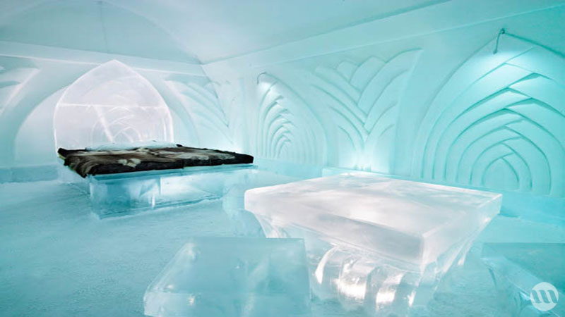 Fait entièrement de glace qui provient des eaux pures de la rivière Torne, l’hôtel de glace, Ice Hotel est installé dans le petit village de Jukkasjärvi à 200 km au Nord dans le cercle polaire. Cet hôtel, fruit d’un projet artistique est une folie unique, connue dans le monde entier, il est construit chaque hiver (ouvre en décembre), et fond chaque été, (ferme mi-avril). Un renouvellement constant qui lui accorde la particularité, d’être unique d’une saison à l’autre et décoré par des artistes designers venant du monde entier. 5000 tonnes de glace et 30 000 tonnes de neige sont nécessaires pour la construction de cet igloo de luxe, qui est entièrement alimenté en énergies renouvelables.