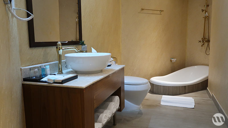 Comme l’on pourrait s’y attendre dans ce décor désertique, les tentes sont d’inspiration orientale. Poussée l’imposante porte en bois et fer forgé, on se retrouve dans une chambre circulaire où se mêlent artisanat local et moderne : Lanterne suspendue, lampes à huiles modernes, fauteuils graphiques et colorés, télévision à écran plat, mini-bar et climatiseur. Derrière deux portes à battants richement sculptées, la salle de bain nous accueille pour un moment de détente absolu, grâce notamment à sa superbe baignoire semi-encastrée, ses petites plantes et les nombreux articles de toilettes mis à disposition pour notre confort. Les chambres sont chics, confortables et cosy. Preuve que l’on peut embrasser l’univers oriental sans forcément faire dans l’ostentation.