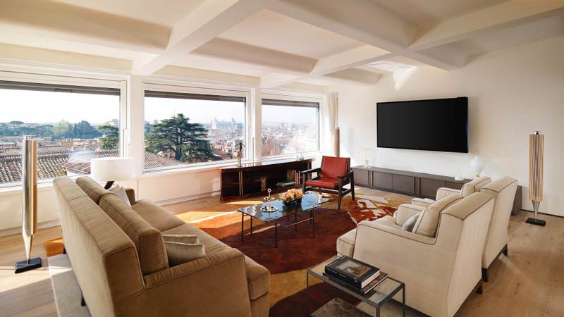 A Rome, l’Hôtel Eden se distingue par son somptueux penthouse Bellavista, autrefois occupé par John F. Kennedy Jr. On accède au penthouse par un ascenseur privé. Des majordomes vous accueillent dans la pièce principale, avec du champagne, que vous pourrez déguster tout en appréciant la vue sur la ville et la Villa Borghèse, par les immenses baies vitrées. Sur un espace de 205 m², la penthouse Bellavista dispose d’un grand bureau, un salon, une salle à manger, une chambre principale adjacente à la salle de bain dont l’opulence de marbre blanc nous frappe de plein fouet. Ici, l’architecture romaine s’allie à l’élégance moderne. Le mobilier a été soigneusement sélectionné pour se fondre harmonieusement dans un ensemble d’objets décoratifs.